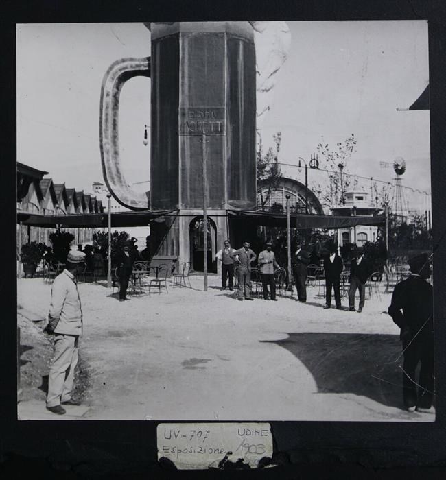 Udine, via Gorghi: stand della Birra Moretti all'Esposizione regionale (1903) con, al centro, un boccale costruito in notevoli dimensioni riempito di birra e, a destra e a sinistra rispetto al colossale elemento, tavolini e sedie, davanti ai quali sono disposti sette uomini in posa.
