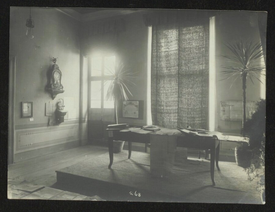 Veduta di un Salone della Biblioteca Civica Vincenzo Joppi: sul tavolo, rialzato su una pedana, dei libri manoscritti ovvero beni culturali presenti in Friuli Venezia Giulia e selezionati dall'Ispettorato tedesco ai Monumenti durante l'occupazione.