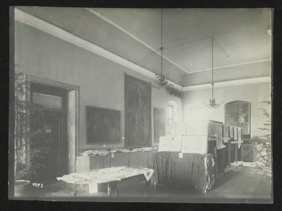 Veduta di un salone della Biblioteca Civica Vincenzo Joppi. In alcuni scaffali sono appesi disegni e fotografie di fotografie di beni culturali presenti in Friuli Venezia Giulia eseguita dall'Ispettorato tedesco ai Monumenti durante l'occupazione. Sui tavoli dei libri e dei disegni. Alle pareti delle tavole e delle tele dipinte.
