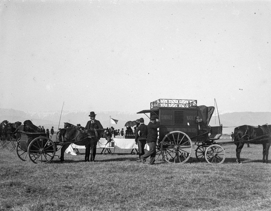 Diverse persone sostano in un campo con cavalli, carri e tavole apparecchiate, probabilmente in attesa di un evento. L'immagine si inserisce all'interno del contesto storico e della presenza dei militari del Reggimento "Cavalleggeri di Saluzzo" che, nel corso della prima guerra mondiale partecipò inizialmente alle operazioni per la conquista del campo trincerato di Gorizia.