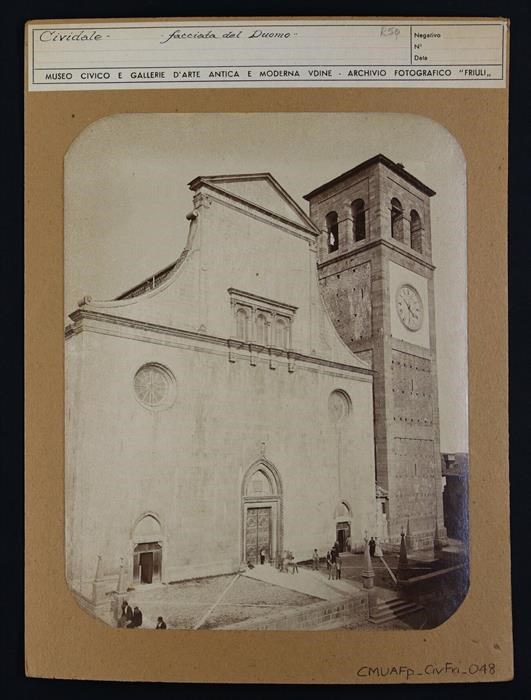 Cividale del Friuli: facciata e campanile del duomo di Santa Maria Assunta. La facciata è stata costruita da Bartolomeo della Cisterna e Pietro Lombardo. In basso: i pinnacoli all'ingresso dell'edificio religioso, a sinistra tre uomini seduti accanto a uno di essi e a destra diverse persone che camminano vicino al Duomo.