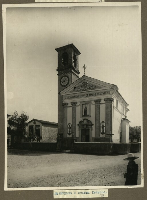 Veduta della facciata della Chiesa dei Santissimi Nomi di Gesù e Maria a Solimbergo di Sequals, assieme al campanile. Attorniata da un muro di cinta, la facciata dell'edificio sacro è tripartita da paraste, presenta un portale architravato con fronte interrotta sovrastata da finestra cieca, al di sopra un frontone triangolare presenta un timpano decorato a mosaico.