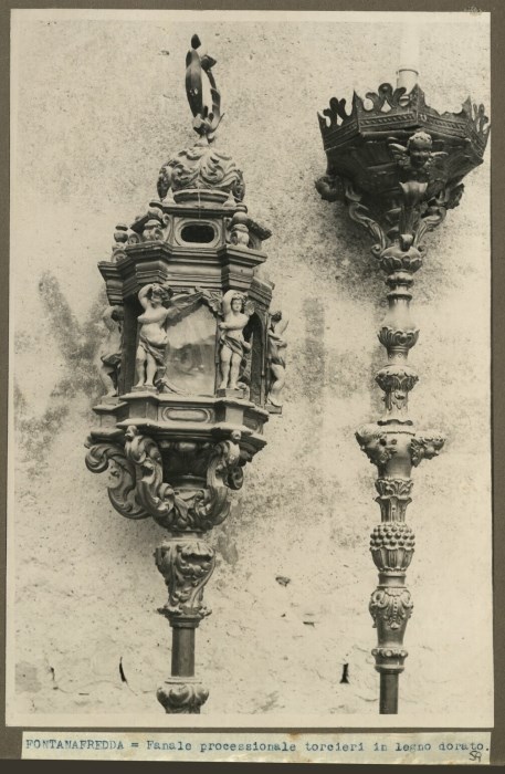 Riproduzione fotografica di un fanale e un torciere processionali in legno dorato e conservati presso la Chiesa di San Giorgio Martire di Fontanafredda.
