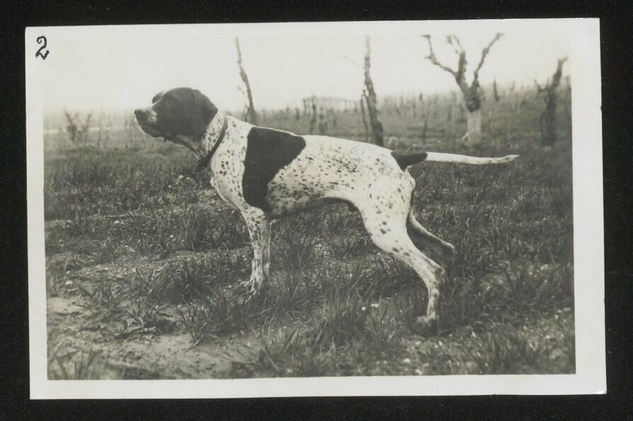 Ritratto di cane da caccia in ferma su pernici.