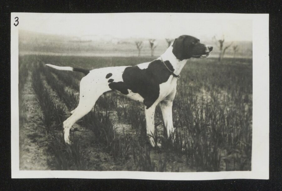 Ritratto di cane da caccia in ferma su pernici.