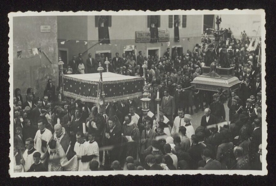 Immagine della processione del 15 agosto 1934 per le celebrazioni del 125° anno della traslazione del cosiddetto "Cristo nero". Si tratta del Crocifisso proveniente dalla Scuola di S. Maria di Consolazione e S. Girolamo detta Scuola di San Fantin di Venezia, esposto per la prima volta alla venerazione dei fedeli di Codroipo il 19 marzo 1809. Il Crocifisso apparteneva alla Confraternita deputata alla Giustizia, detta “Scuola dei picai” o “della buona morte”, una delle Scuole maggiori di Venezia, ed accompagnava al luogo del supplizio i condannati a morte, ai quali veniva fatto baciare come ultimo gesto di misericordia cristiana. Ultimo Cappellano della Scuola, fino alla soppressione da parte del governo napoleonico, era il friulano don Leandro Tiritelli, fratello dell’allora Arciprete di Codroipo mons. Zaccaria Tiritelli, grazie alla cui iniziativa il Crocifisso venne donato alla Chiesa codroipese.
