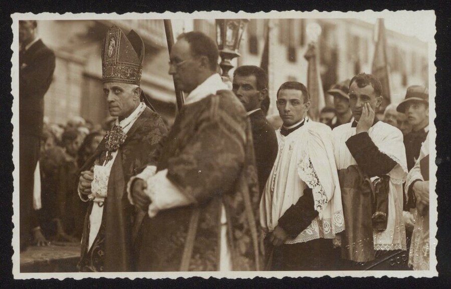 L'arcivescovo di Udine Giuseppe Nogara alla processione del 15 agosto 1934 per le celebrazioni del 125° anno della traslazione del cosiddetto "Cristo nero" di Codroipo. Si tratta del Crocifisso proveniente dalla Scuola di San Fantin di Venezia, esposto per la prima volta alla venerazione dei fedeli di Codroipo il 19 marzo 1809. Il Crocifisso apparteneva alla Confraternita deputata alla Giustizia, detta “Scuola dei picai” o “della buona morte”, una delle Scuole maggiori di Venezia, ed accompagnava al luogo del supplizio i condannati a morte, ai quali veniva fatto baciare come ultimo gesto di misericordia cristiana. Ultimo Cappellano della Scuola, fino alla soppressione da parte del governo napoleonico, era il friulano don Leandro Tiritelli, fratello dell’allora Arciprete di Codroipo mons. Zaccaria Tiritelli, grazie alla cui iniziativa il Crocifisso venne donato alla Chiesa codroipese.