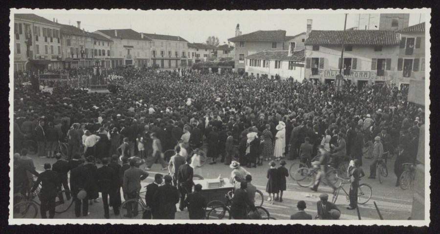 Un momento delle celebrazioni del 125° della traslazione del cosiddetto "Cristo nero", dalla Scuola Grande detta di S. Fantino di Venezia alla Chiesa Parrocchiale di Codroipo, dove venne esposto per la prima volta nella Quaresima del 1809. Il Crocifisso apparteneva alla Confraternita deputata alla Giustizia ed accompagnava al luogo del supplizio i condannati a morte, ai quali veniva fatto baciare come ultimo gesto di misericordia cristiana. Nel 1934, 125° anniversario, i festeggiamenti videro l’Arcivescovo Mons. Giuseppe Nogara celebrare il pontificale ed intervenire alla solenne processione del pomeriggio, vivificata dalla presenza di oltre quindicimila persone. Nell'immagine, la folla di fedeli partecipanti alle celebrazioni: in primo piano si notano numerose biciclette e, in basso al centro, anche un venditore di gelati con il relativo carretto