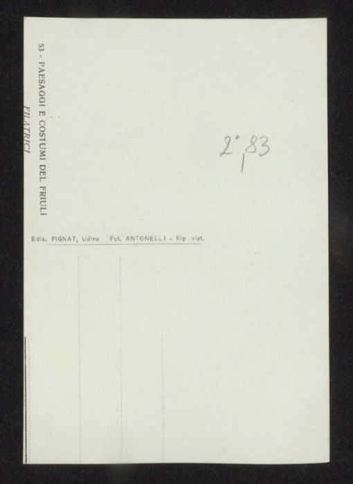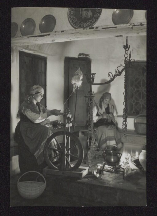 Lo scatto di Umberto Antonelli, farmacista e fotografo attivo in Carnia tra 1909 e 1949, è parte della serie di cartoline pubblicate dal fotografo editore Carlo Pignat con il titolo "Paesaggi e Costumi del Friuli" nella seconda metà degli anni Trenta del Novecento, raffiguranti tutte una Carnia e un Friuli arcadici. L'immagine ritrae due donne in costumi tradizionali carnici vicino al "fogolar" nella casa detta "das Toscjanas" a Enemonzo (edificio demolito dopo il terremoto del 1976). La donna in primo piano sta filando con l'aiuto dell'arcolaio.