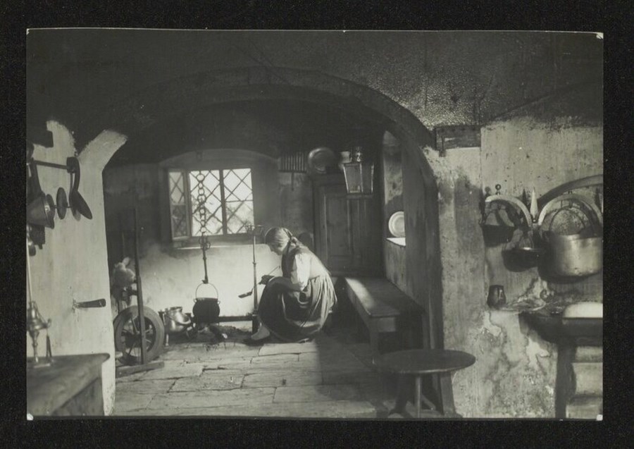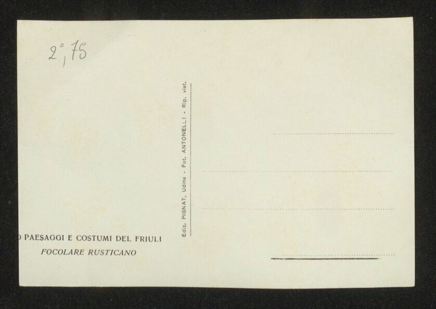 Lo scatto di Umberto Antonelli, farmacista e fotografo attivo in Carnia tra 1909 e 1949, è parte della serie di cartoline pubblicate dal fotografo editore Carlo Pignat con il titolo "Paesaggi e Costumi del Friuli" nella seconda metà degli anni Trenta del Novecento, raffiguranti tutte una Carnia e un Friuli arcadici. L'immagine ritrae una donna in abiti tradizionali carnici mentre cucina nel "fogolar".