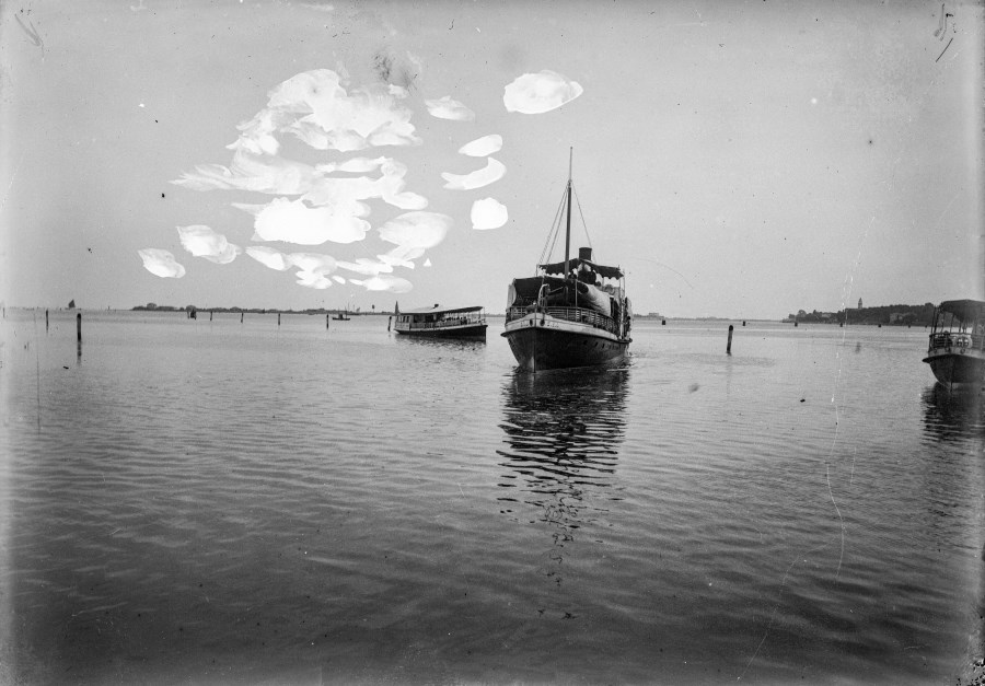Veduta della laguna di Venezia: delle imbarcazioni sulle Fondamente Nove e, nello sfondo, l'isola di San Michele.