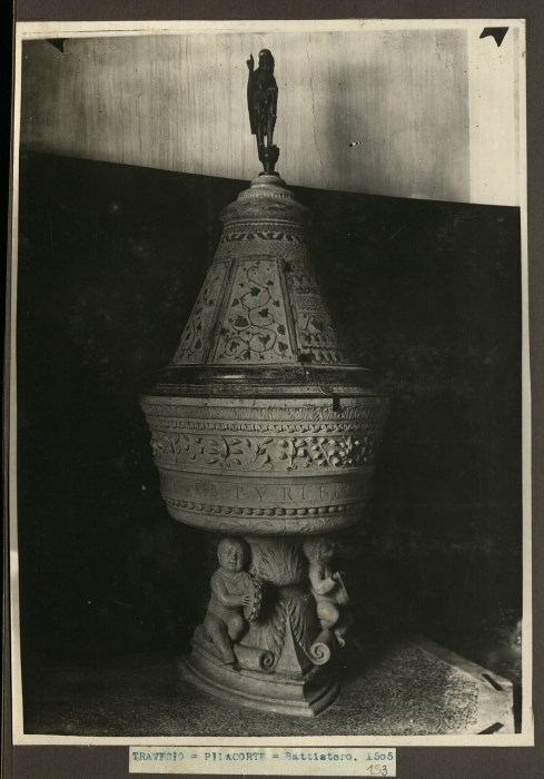 Riproduzione fotografica della fonte battesimale con copertura del Pilacorte databile al 1490 circa presso la Chiesa di San Pietro Apostolo di Travesio. Sulla coppa, un'iscrizione, racchiusa tra fasce decorate a bassorilievo con motivi geometrici e vegetali. Essa poggia su una singolare base triangolare, ai cui lati si dispongono tre angioletti musicanti seduti sul risvolto delle foglie d’acanto che ricoprono il fusto. Il fonte si presenta con una copertura metallica del XVII sec, lavorata a sbalzo e colorata.