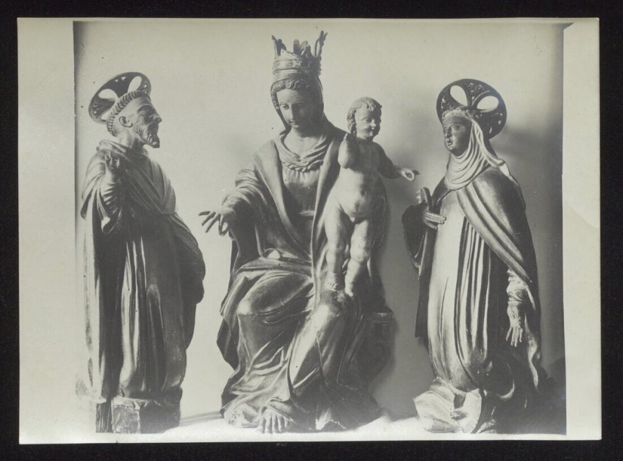 Gruppo scultoreo in legno, databile al XVI secolo, rappresentante la Madonna col Bambino fra San Domenico e Santa Teresa presso la chiesa di Santa Maria Assunta a Cella, frazione di Forni di Sopra.