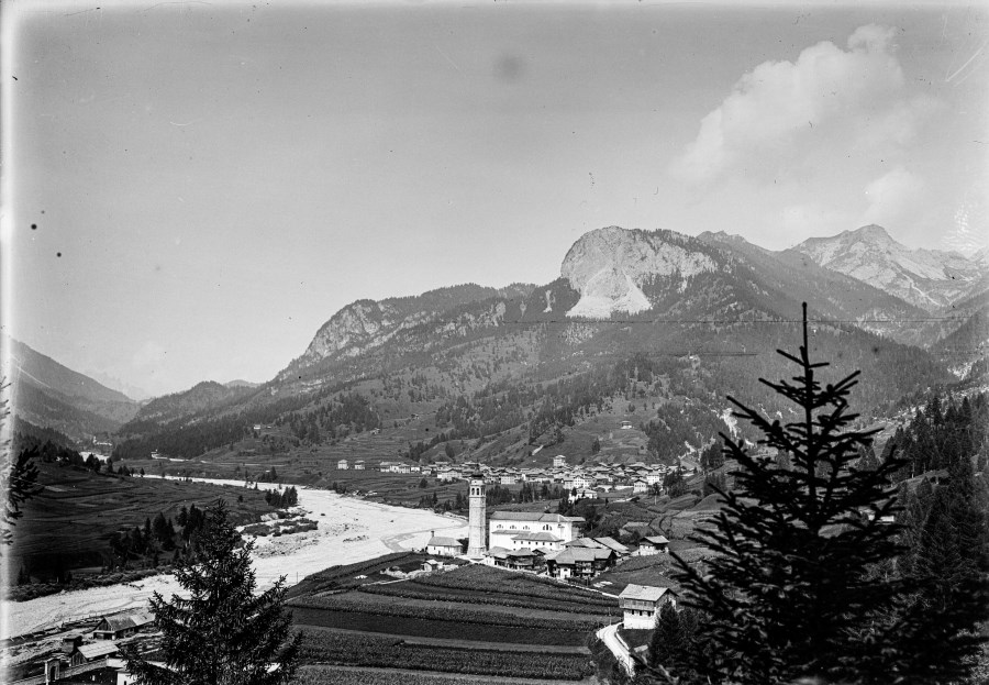 Veduta del paese di Forni di Sopra situata accanto al greto del fiume Tagliamento e alle pendici del Clap Varmost.