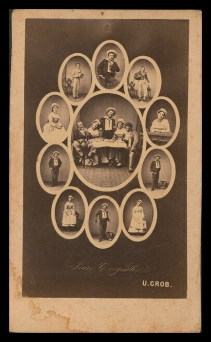 Ritratto multiplo, a mosaico, di Jean-François Berthelier (1830–1888), tenore e attore teatrale francese. Debuttò professionalmente con il personaggio di Fernando ne "La favorita" di Donizetti, al Teatro di Poitiers nel 1849. Nel 1851 venne a Parigi e inizialmente apparve come cantante nei Café-concert e compositore di brani con il nome d'arte Berthel. Il 5 luglio 1855, il teatro dell'operetta Bouffes-Parisiens di Jacques Offenbach aprì con la prima dell'opera per due persone "Les deux Aveugles, e Berthelier cantò con grande successo di pubblico. Divenne quindi il giullare delle produzioni di operette di Offenbach al Bouffes-Parisiens, al Théâtre des Variétés , al Théâtre des Nouveautés e al Palais Royal. Dopo il declino dell'operetta di Offenbach negli anni '70 dell'Ottocento, Berthelier lavorò come intrattenitore e cantante nei teatri di varietà.