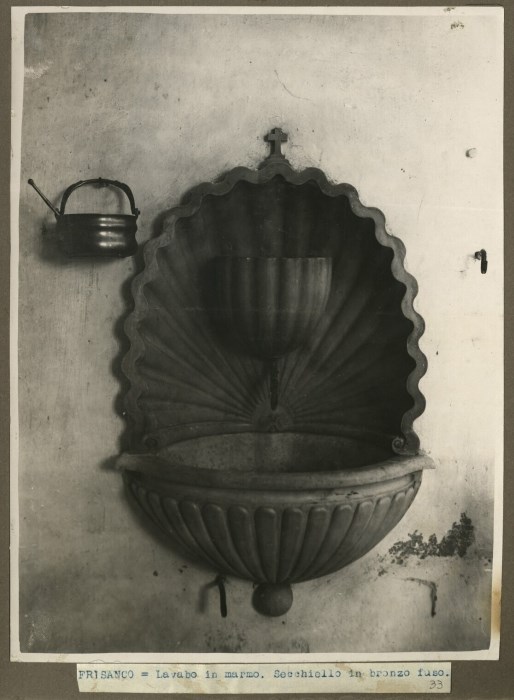 Riproduzione fotografica di un lavabo in marmo incastonato in una parete, probabilmente nella sacrestia e che, per la forma, ricorda la conchiglia di San Giacomo; in alto a sinistra appeso al puro un secchiello in bronzo con aspersorio.