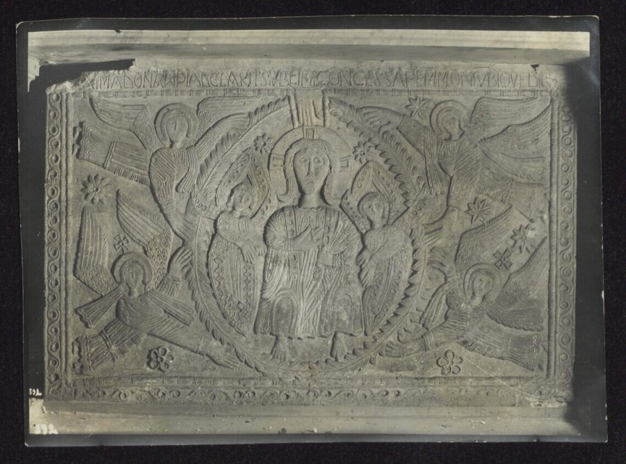 Riproduzione fotografica del frontone in pietra dell'Ara di Ratchis, ora conservato presso il Museo Cristiano e Tesoro del Duomo a Cividale del Friuli. Il Cristo in maestà, in bassorilievo, si colloca nel prospetto frontale dell'altare. Cristo (Maiestas) ascende in cielo all'interno di una mandorla arborea, sorretta da quattro angeli ed è affiancato da altri due angeli. Un delicato motivo ornamentale incornicia la scena.