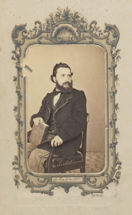 Ritratto in studio del signor G. Cellotti: seduto in una poltroncina con in mano un libro, il suo sguardo non è rivolto al fotografo.