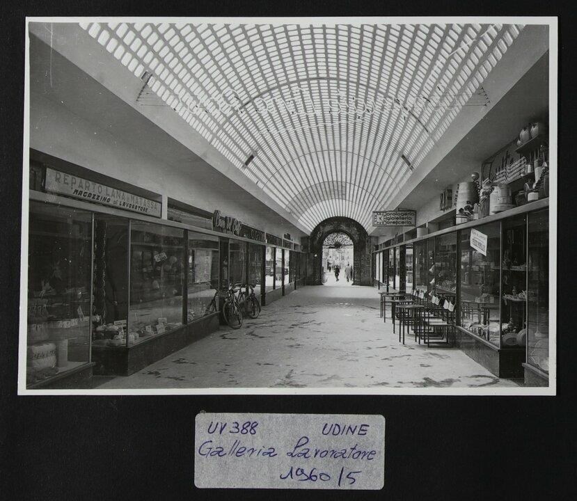 Udine, via Paolo Canciani 17: veduta in prospettiva dell'interno della Galleria Bardelli ("Il Lavoratore"), nata su progetto dell'architetto Ermes Midena per collegare via Antonio Zanon a via Paolo Canciani. A destra e a sinistra, alcuni tavolini. In primo piano, a sinistra, si legge in un'insegna "REPARTO LANA e MATASSA/ MAGAZZINO al LAVORATORE". In primo piano a destra, nella prima vetrina, stoviglie esposte.
