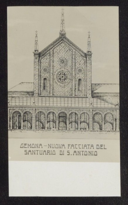 Riproduzione del prospetto grafico della nuova facciata del Santuario di Sant'Antonio a Gemona del Friuli ricostruito in linee architettoniche moderne dopo il terremoto del 1976.