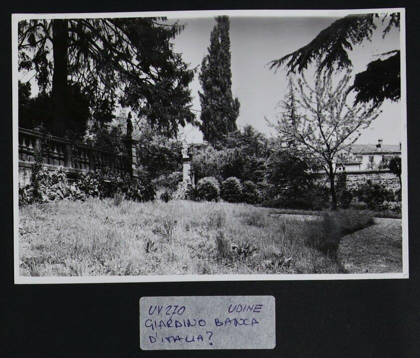Udine: giardino di Palazzo Antonini-Maseri (sede della Banca d'Italia dal 1900 fino al 2009) realizzato su progetto dell'architetto Andrea Palladio e su commissione dell'aristocratico Floriano Antonini (1556). A sinistra, balaustra in pietra adornata da sculture.