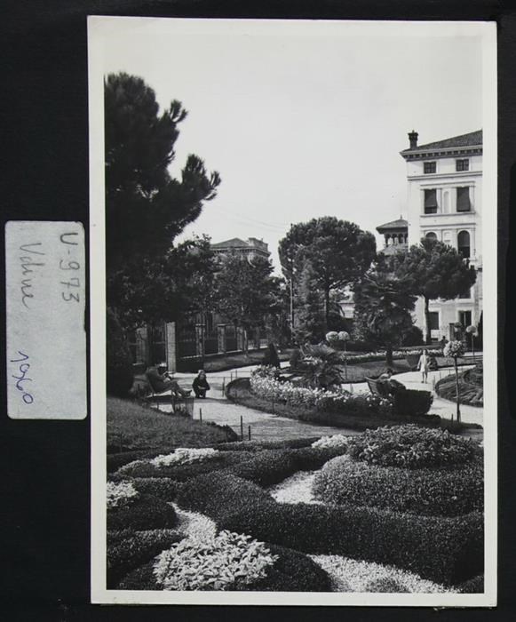 Udine: veduta di uno scorcio del Giardino "Giovanni Pascoli" progettato da Ettore Gilberti (inizi degli anni Trenta del Novecento), in origine chiamato "Giardini pubblici Arnaldo Mussolini". In secondo piano a destra, la Casa del Littorio, costruita sotto la direzione dei lavori di Ettore Gilberti (1931-1932). Subito dietro, Palazzo Agricola (degli inizi del Novecento). Verso sinistra si intravede la scuola elementare al tempo intitolata a Vittorio Emanuele III, ora a Dante Alighieri (1902-1905), edificata nell'ex “Braida Codroipo“.