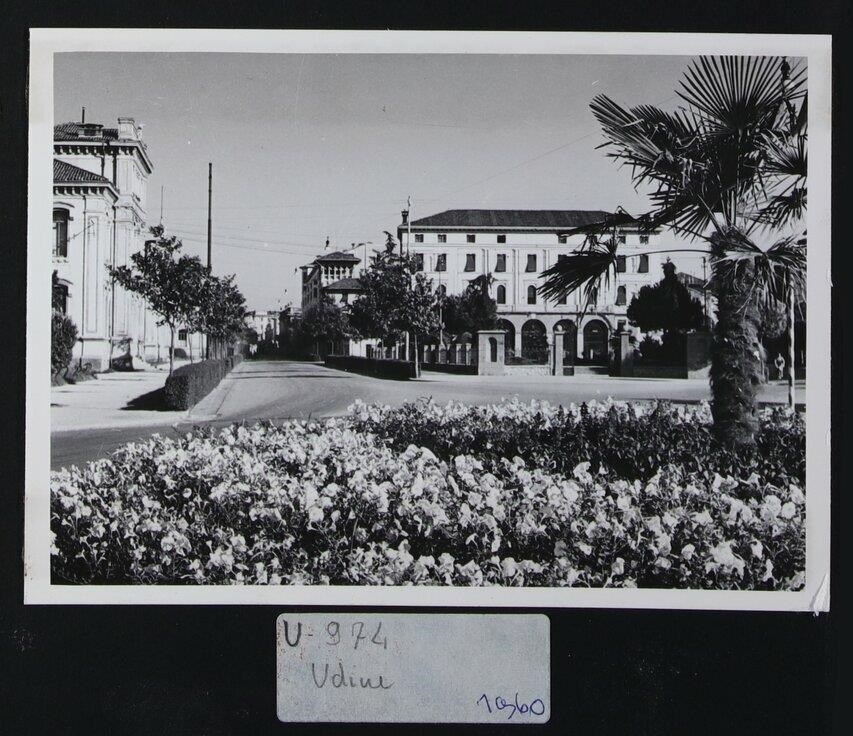 Udine: veduta di uno scorcio del Giardino "Giovanni Pascoli" progettato da Ettore Gilberti (inizi degli anni Trenta del Novecento), in origine chiamato "Giardini pubblici Arnaldo Mussolini". In secondo piano, la Casa del Littorio, costruita sotto la direzione dei lavori di Ettore Gilberti (1931-1932). Sullo sfondo, Palazzo Agricola (degli inizi del Novecento) e Palazzo Fior, edificio pluripiano dell'architetto Benvenuto Elia Fior (1935). A sinistra, la scuola elementare al tempo intitolata a Vittorio Emanuele III, ora a Dante Alighieri (1902-1905), edificata nell'ex “Braida Codroipo“.