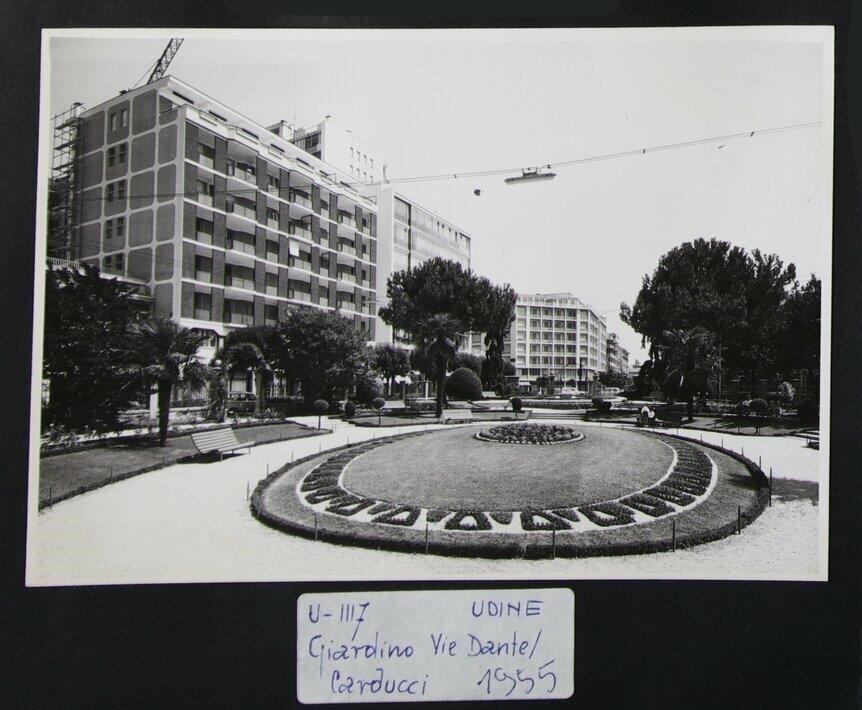 Udine: in primo piano, il Giardino "Giovanni Pascoli" progettato da Ettore Gilberti (inizi degli anni Trenta del Novecento), in origine chiamato "Giardini pubblici Arnaldo Mussolini". In secondo piano a sinistra, un condominio in costruzione e, in secondo piano al centro, il grattacielo Rinci dell'impresa di Paolo Rinci (fine degli anni Cinquanta) ad uso residenziale.