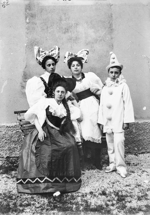 Ritratto di un gruppo di giovani in costume mascherato: tre ragazze con abiti dalle grandi maniche a sbuffo e un grande fiocco sul capo, un bambino con costume da "Pierrot".