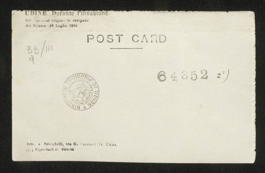 Il13 luglio 1918 gli austro-ungarici requisirono le campane del duomo di Udine e furono spedite negli Imperi centrali per essere fuse e riutilizzate a scopi bellici. Nell'immagine i soldati caricano le campane su di un camion.