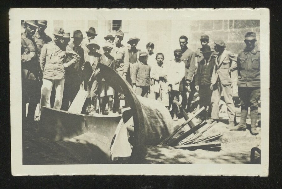 Un gruppo di persone, soldati, uomini e bambini mentre guardano la campana maggiore del Duomo completamente a pezzi a terra: nel giorno del 13 luglio 1918 gli austro-ungarici requisirono le campane del duomo e spedite negli Imperi centrali per essere fuse e riutilizzate a scopi bellici.