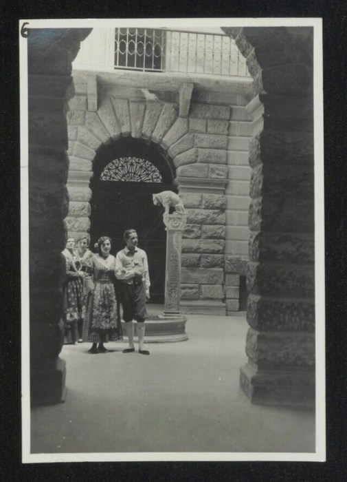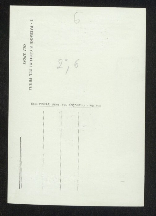 Lo scatto di Umberto Antonelli, farmacista e fotografo attivo in Carnia tra 1909 e 1949, è parte della serie di cartoline pubblicate dal fotografo editore Carlo Pignat con il titolo "Paesaggi e Costumi del Friuli" nella seconda metà degli anni Trenta del Novecento, raffiguranti tutte una Carnia e un Friuli arcadici. L'immagine ritrae una coppia di sposi in abiti popolari festivi friulani all'interno del cortile di palazzo Frangipane a Tarcento; alle loro spalle, due donne ugualmente in abiti tradizionali.