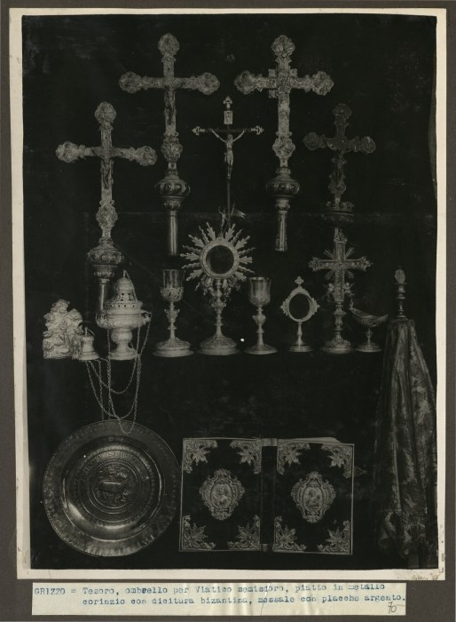 sei crocefissi, un turibolo, due ostensori, due calici, un ombrello per viatico con decorazioni dorate, un piatto in metallo corinzio con dicitura bizantina ed un messale con placche in argento.