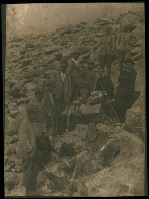 Gruppo di militari, civili e due sacerdoti raccolti davanti alla salma di un caduto della Prima Guerra mondiale; la salma è a terra, sulla roccia, avvolta in teli: si vede la pianta degli scarponi