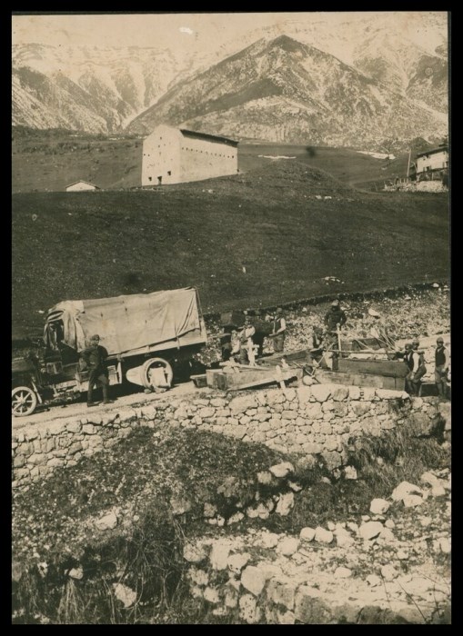 Gruppo di militari intento a caricare bare con le salme dei caduti della Grande Guerra su un automezzo telonato