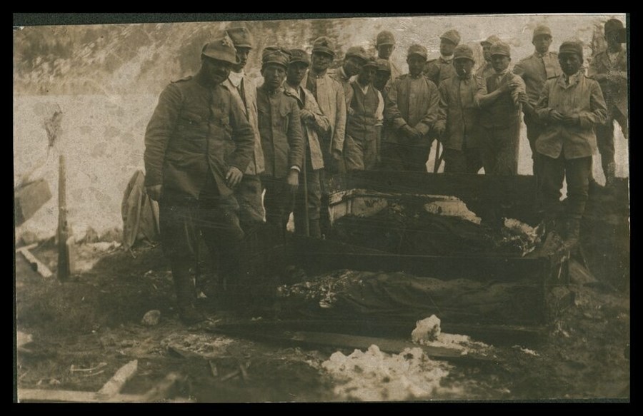 Soldati ritratti accanto alle salme dissepolte di due caduti della Prima Guerra mondiale