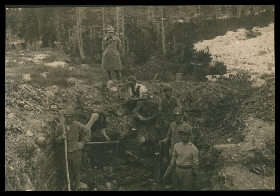 Gruppo di soldati che scavano, recuperando le salme dei caduti della Prima Guerra mondiale
