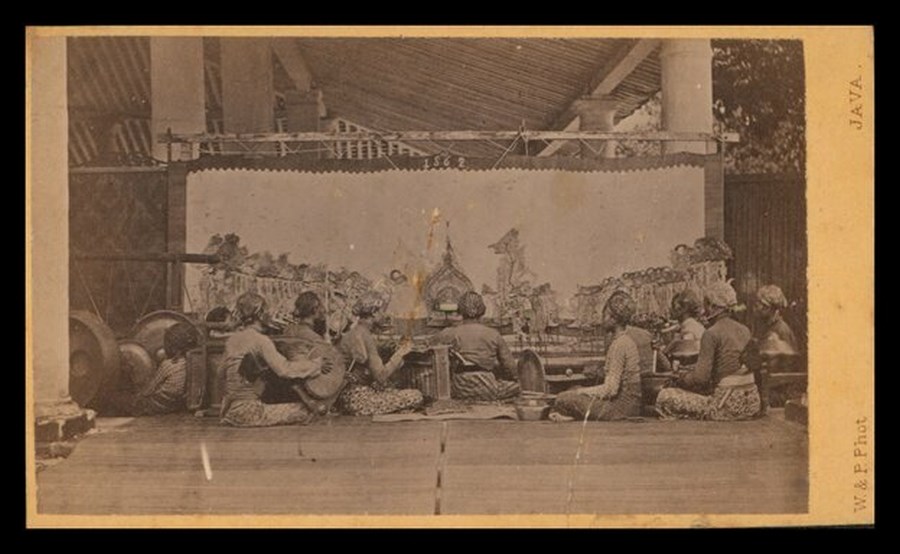 Gruppo di suonatori giavanesi (Java) seduti, ritratti di fronte ad una scenografia