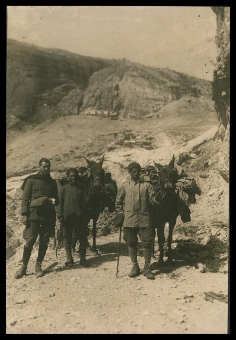 Gruppo di tre soldati, ritratti in zona montuosa, due dei quali conducono ciascuno un mulo da soma