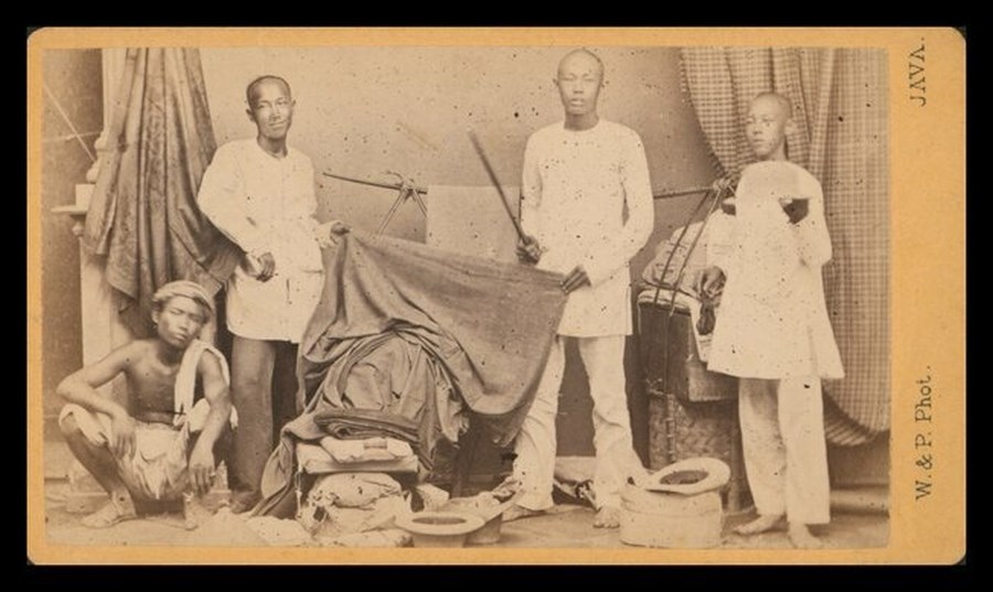 Gruppo di venditori ambulanti giavanesi (Java) con le loro mercanzie