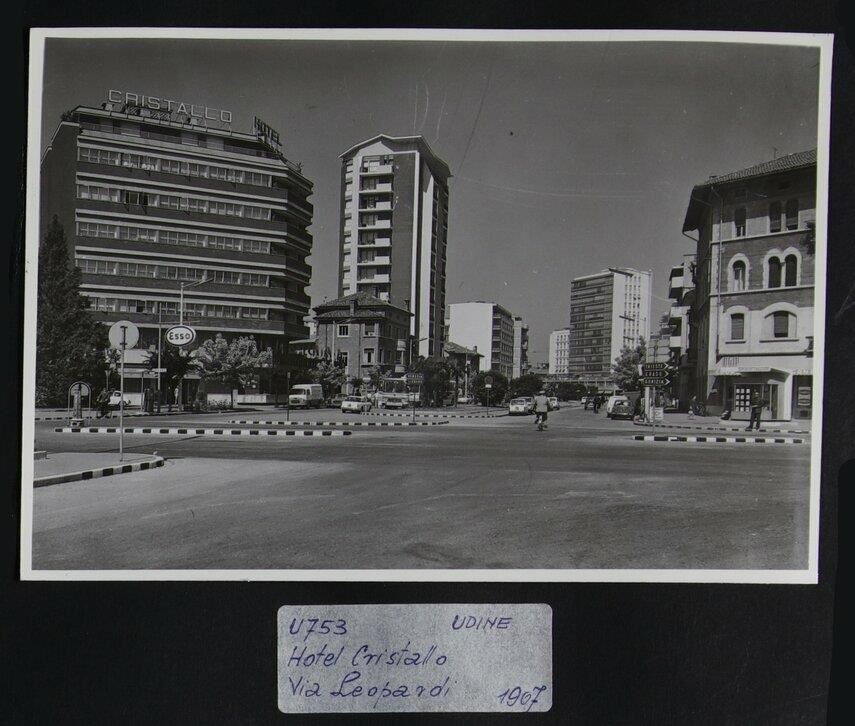 Udine: veduta di viale Giacomo Leopardi e piazza della Repubblica. A sinistra, l'hotel Cristallo e lo stabilimento dell'azienda petrolifera Ɛsso. In secondo piano a destra, grattacielo Rinci, dell'impresa di Paolo Rinci, ad uso residenziale (fine degli anni Cinquanta).