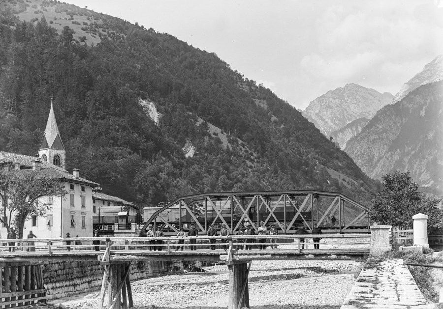 Veduta dei ponti sul torrente Pontebbana che collegavano gli abitati di Pontebba, in Italia, con Pontafel, nell'Impero Austroungarico. Il torrente Pontebbana rappresentò, infatti, fino al termine della Grande Guerra, il confine tra le terre italiche e il mondo tedesco, tra la Serenissima e il Vescovado di Bamberga, prima, e tra il Regno d’Italia e l’Impero Austroungarico fino al trattato di St. Germain (settembre 1919). In primo piano, il ponte di legno con alcuni passanti; in secondo piano il ponte ferroviario con alcuni vagoni merci in transito: la dogana era posta appena di qua e di là del ponte sul torrente. Sullo sfondo le montagne del Canal del Ferro e a sinistra l'abitato italiano di Pontebba in cui si scorge il campanile della Chiesa di Santa Maria Maggiore. Entrambi i ponti vennero fatti saltare dagli austriaci il 25 maggio 1915.