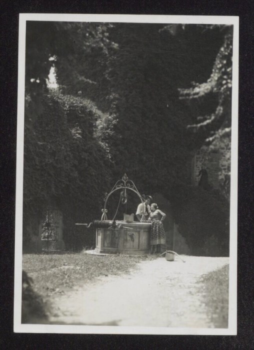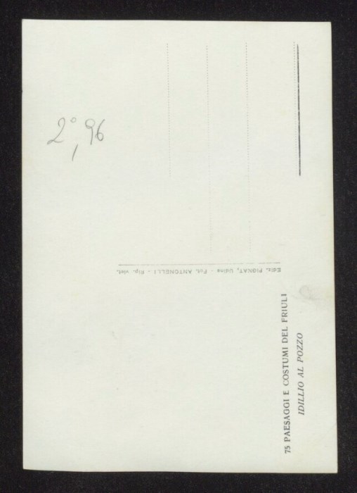 Lo scatto di Umberto Antonelli, farmacista e fotografo attivo in Carnia tra 1909 e 1949, è parte della serie di cartoline pubblicate dal fotografo editore Carlo Pignat con il titolo "Paesaggi e Costumi del Friuli" nella seconda metà degli anni Trenta del Novecento, raffiguranti tutte una Carnia e un Friuli arcadici. L'immagine ritrae un uomo, il modello Italo Lucino Bearzi, mentre conversa amorevolmente con una donna vicino al vecchio pozzo del Castello di Colloredo di Monte Albano. Entrambi indossano abiti tradizionali friulani.