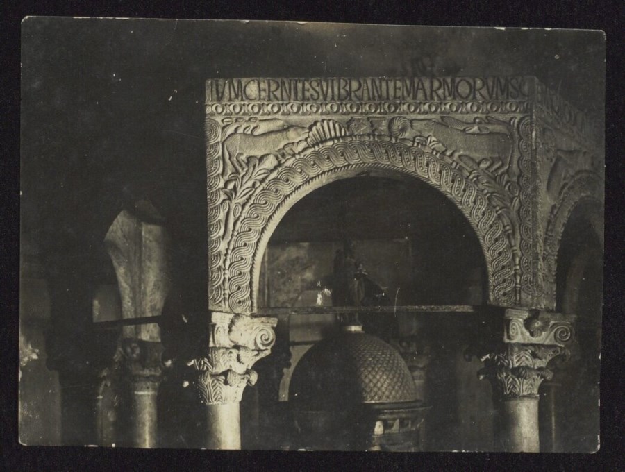 Particolare del tegurio del Battistero di Callisto ora conservato presso il Museo Cristiano di Cividale del Friuli. Il tegurio, composto da ampi archi a tutto sesto sostenuti da colonne corinzie, è adornato da iscrizioni e da motivi vegetali, animali e geometrici.