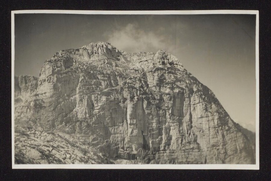 Il Monte Bila Pec (m. 2149), cima rocciosa sul versante settentrionale del Gruppo del Canin, che emerge dall'altopiano carsico con una verticale parete e domina la conca del “Vallon di Prevala” dove si trova il Rifugio Gilberti - Soravito, nei cui pressi il fotografo ha scelto il punto della ripresa dell'immagine.