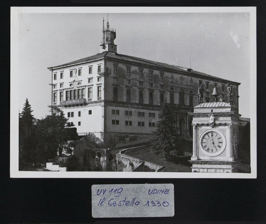 Udine: veduta del castello e della Torre dell'Orologio (in primo piano a destra), che si innesta sulla Loggia di San Giovanni, di Giovanni da Udine (1527). In cima alla Torre, i due Mori e, in mezzo a loro, una campana.