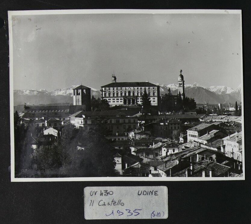 Udine: veduta aerea di uno scorcio della città con le Alpi. A sinistra, il duomo e il campanile (prima metà del Duecento). Al centro il castello e, a destra, il campanile della chiesa di Santa Maria di Castello.