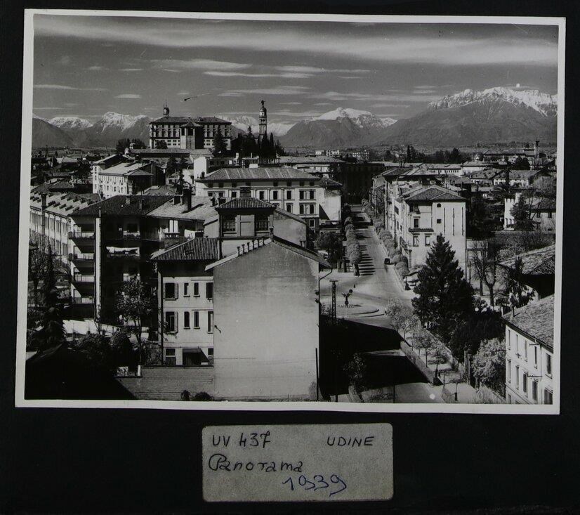 Udine: veduta aerea di uno scorcio della città con le Alpi. In fondo verso sinistra, il castello e il campanile della chiesa di Santa Maria di Castello. Si noti la scultura dorata e girevole con l'arcangelo Gabriele in cima alla cupola emisferica, portata a termine da Giovanni da Udine, appartenente al campanile cinquecentesco della chiesa, progettato da Gaspare Negro.