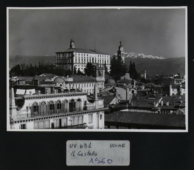 Udine: veduta aerea di uno scorcio della città con le Alpi. Verso il centro, il castello e il campanile della chiesa di Santa Maria di Castello. In secondo piano al centro, la Torre dell'Orologio di Giovanni da Udine (1527) che si innesta sulla Loggia di San Giovanni. In primo piano a sinistra, Palazzo INA, realizzato su progetto di Provino Valle con la collaborazione di Pietro Valle (1921-1924). Sullo sfondo, a destra, si intravede il campanile della chiesa di San Francesco (seconda metà del XIII secolo).