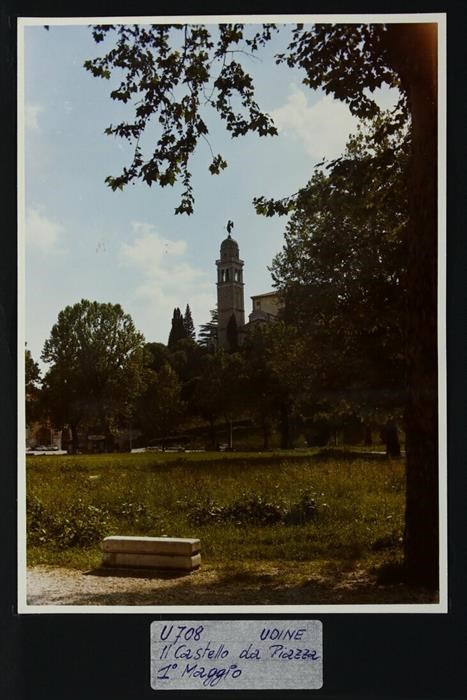 Udine, piazza I Maggio: sul colle del castello, il campanile cinquecentesco della chiesa di Santa Maria di Castello progettato da Gaspare Negro, con la scultura dorata e girevole rappresentante l'arcangelo Gabriele, in cima alla cupola emisferica portata a termine da Giovanni da Udine. Accanto, il castello.
